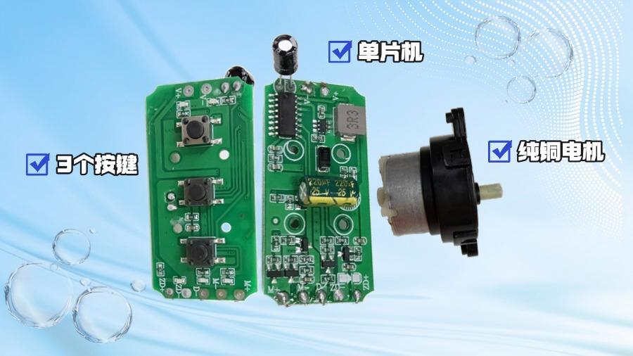 ①核心驱动模块:单片机精准调控转速(2档)及运行时间(3档定时)