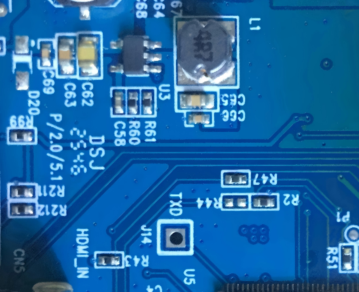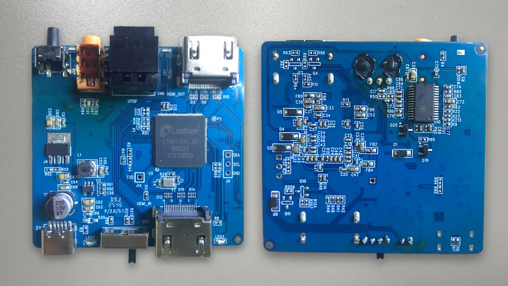如图所示:5V直流电源经LDO稳压至3.3V,为NX8420和LT8641UXE_U5两颗主控芯片供电;HDMI音视频输入后,由LT8641主控芯片处理并输出HDMI视频信号,NX8420负责环出同轴/光纤(3.5mm/SPDIF)数字音频信号,且支持音效与音频模式切换(Dolby/7.1)。