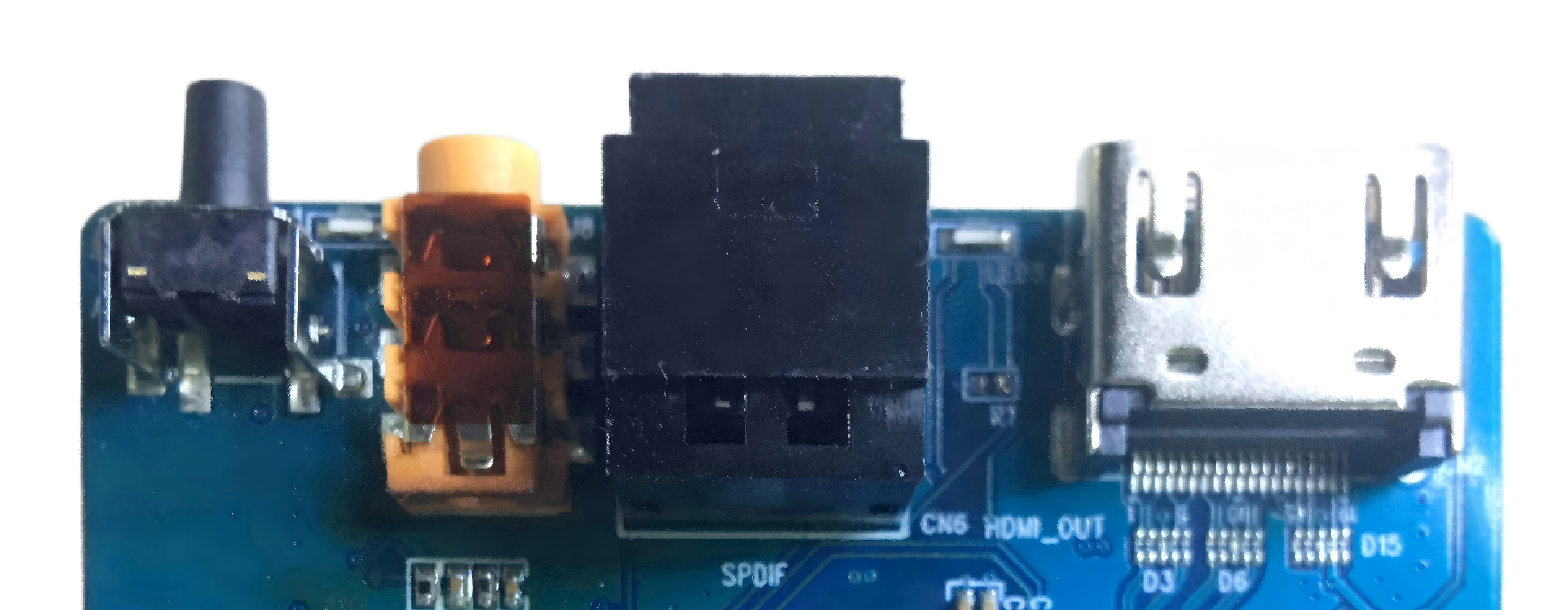 后侧接口(自左向右):音效切换按钮、3.5mm音频输出接口、SPDIF接口(用于数字音频信号的传输)、HDMI OUT高清输出接口。